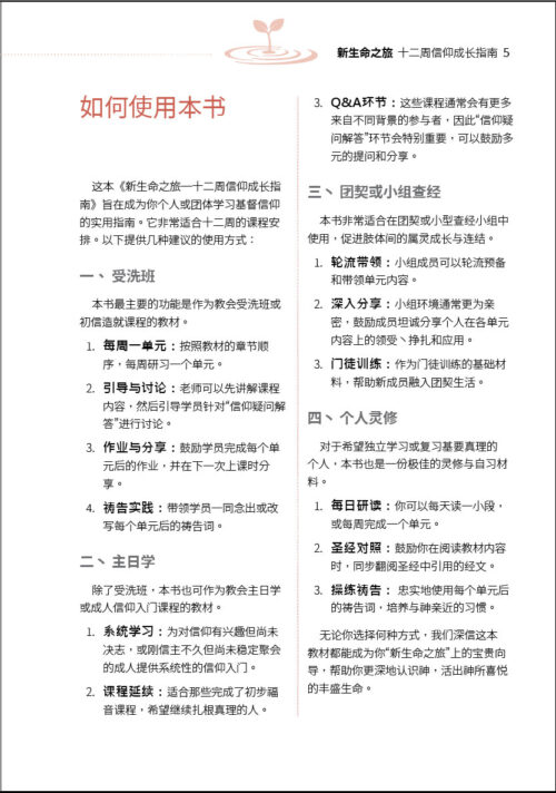 无论你选择何种方式,我们深信这本教材都能成为你「新生命之旅」上的宝贵向导,帮助你更深地认识神,活出神所喜悦的丰盛生命。
