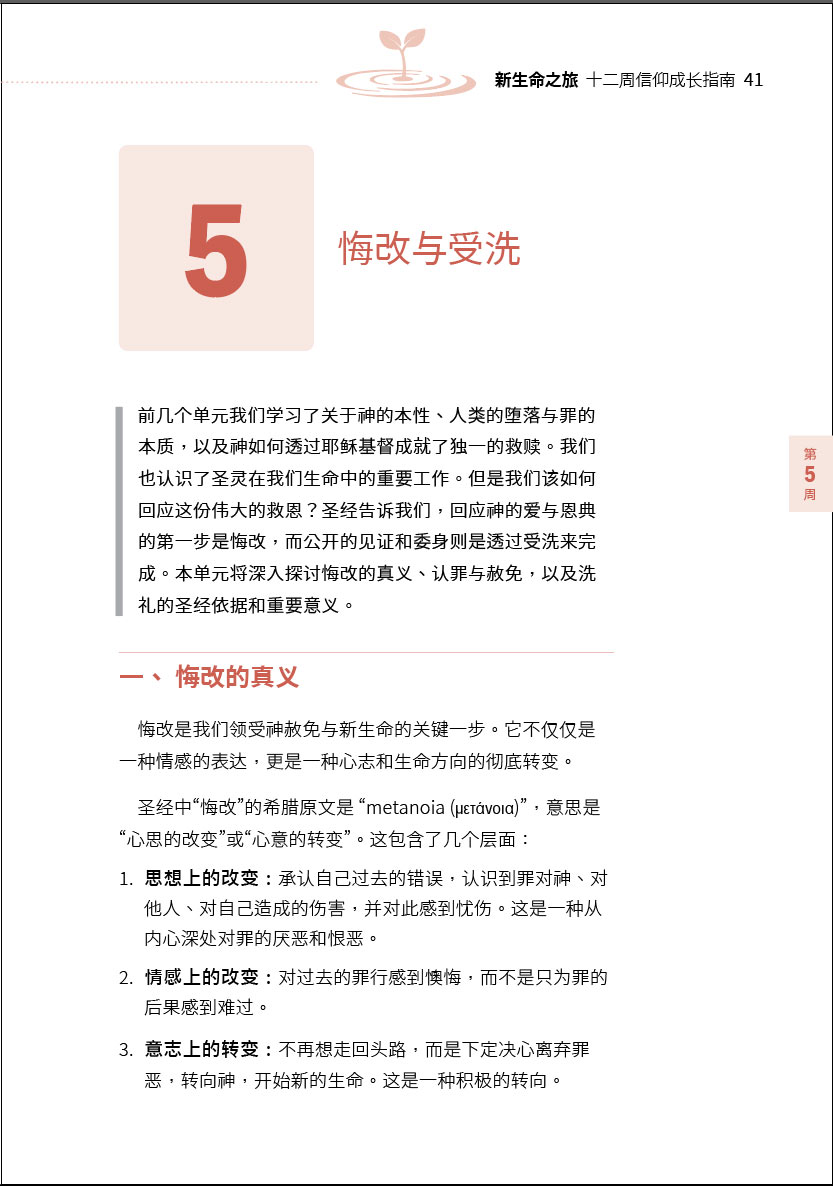 悔改的真义;认罪与赦免;受洗的依据与目的;洗礼的形式