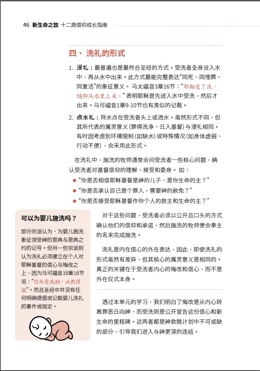 除了受洗班,本书也可作为教会主日学或成人信仰入门课程的教材。