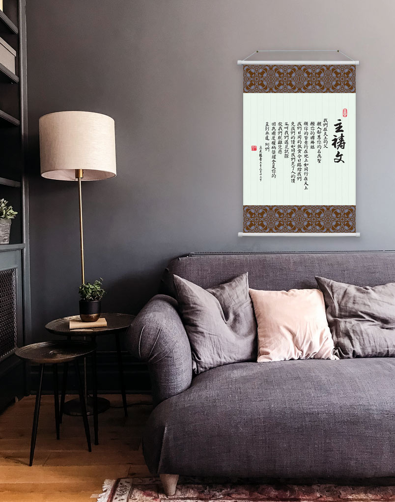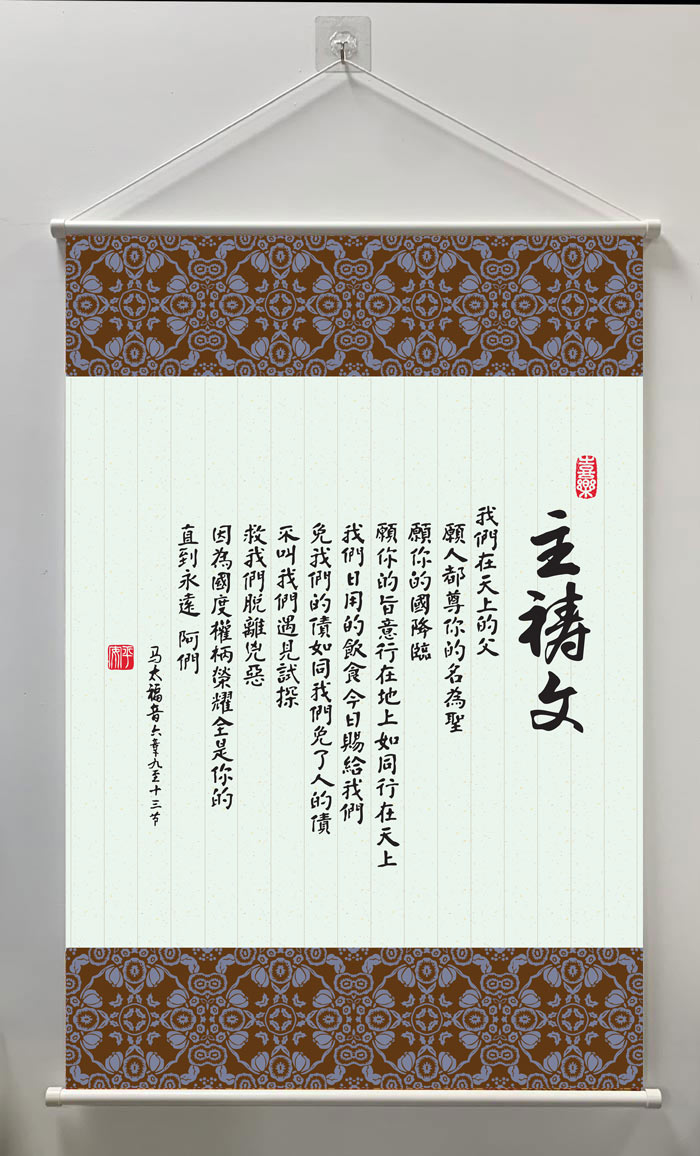 這幅主禱文書法掛軸,以端莊的筆觸展現主耶穌教導門徒的禱告,提醒我們每日以敬畏與感恩的心親近天父。無論懸掛於家中、辦公室、或教會中,都能營造出平安、敬虔的屬靈氛圍。