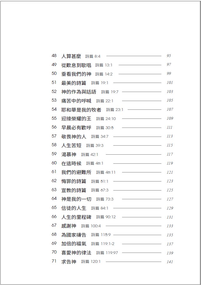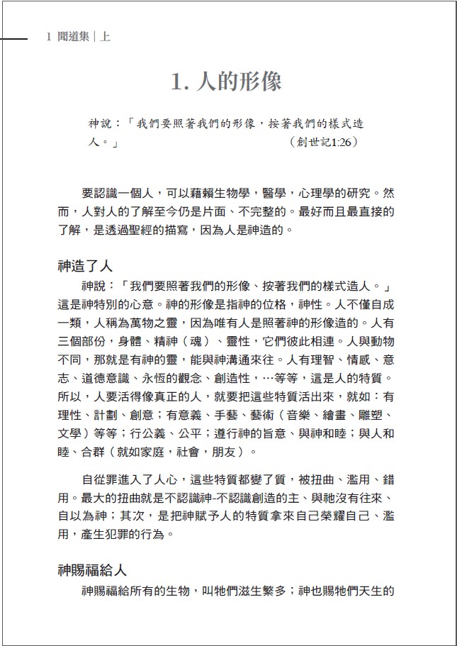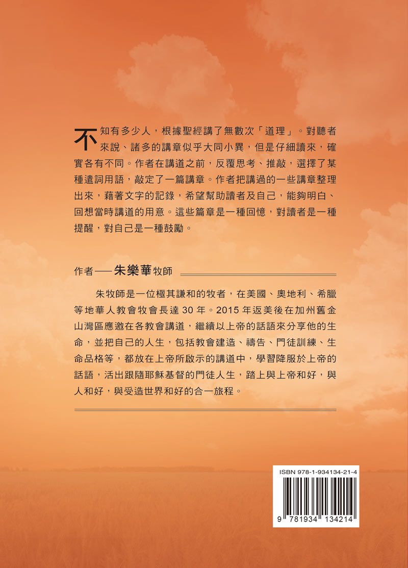 「不知有多少人,根據聖經講了無數次「道理」。對聽者來說、諸多的講章似乎大同小異,但是仔細讀來,確實各有不同。作者在講道之前,反覆思考、推敲,選擇了某種遣詞用語,敲定了一篇講章。作者把講過的一些講章整理出來,藉著文字的記錄,希望幫助讀者及自己,能夠明白、回想當時講道的用意。這些篇章是一種回憶,對讀者是一種提醒,對自己是一種鼓勵。」